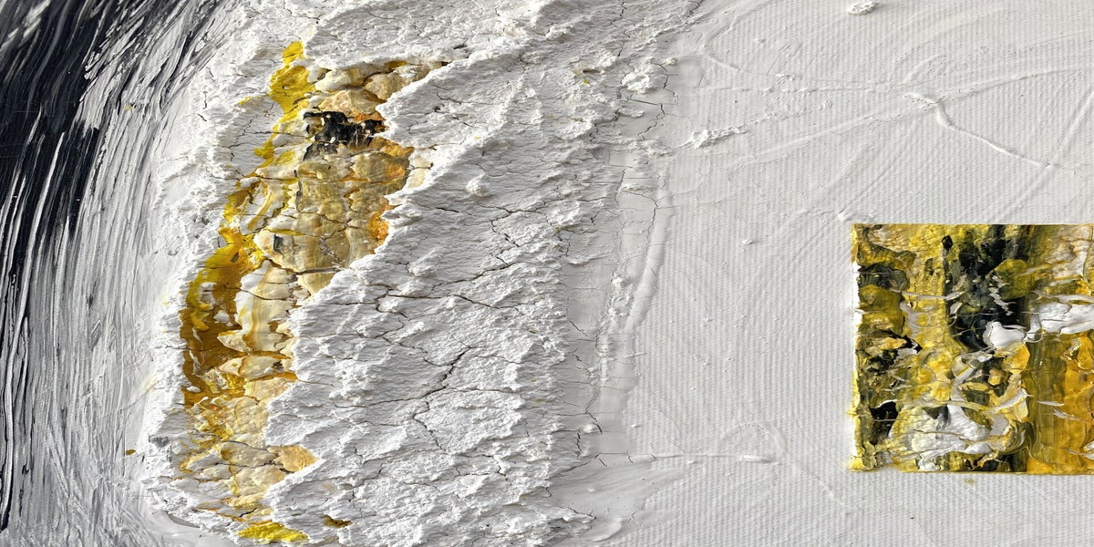 Das Bild strahlt trotz seiner kontrastreichen Seite eine gewisse Ruhe aus. Das gelbe Band, das sich sowohl farblich als auch texturiell vom Rest abhebt trennt und verbindet zugleich die Seiten dunkel und hell. Das Band ist aus Modelliermasse und Leintuch gefertigt, was eine reliefartige Struktur erzeugt und ein taktiles Element in das Bild einbringt. In der unteren linken Ecke befindet sich ein kleines, abstraktes Quadrat, das sich farblich in den Rest des Bildes einfügt. Die Kombination von schwarz-weißem Hintergrund, weißem Raum und gelbem Band schafft ein starkes Kontrastverhältnis und kann verschiedene Assoziationen und Interpretationen hervorrufen.
