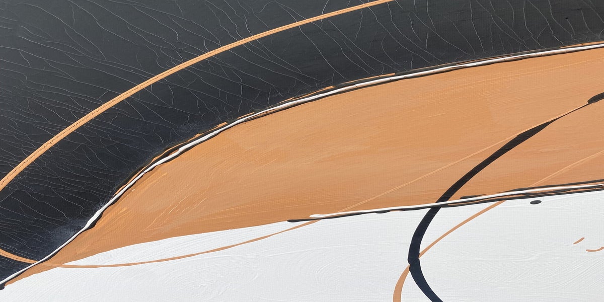 Die dominierenden Farbtöne in hellem Orange, Gelb und Rot, die miteinander verschmelzen erzeugen eine warme und energetische Atmosphäre.Ein harmonischer Verlauf der Farben entsteht, wenn sie sich auf der gesamten Leinwand nahtlos vermischen und eine fließende Komposition bilden. Die schwarzen Farblinien im Vordergrund verleihen dem Bild Struktur und Dynamik, und ihr Kontrast zu den leuchtenden Farben schafft eine fesselnde visuelle Spannung.