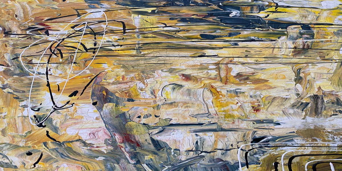 Die abstrakten Formen und Linien erzeugen eine energetische Bewegung, während das intensive Gelb eine warme und positive Atmosphäre schafft.