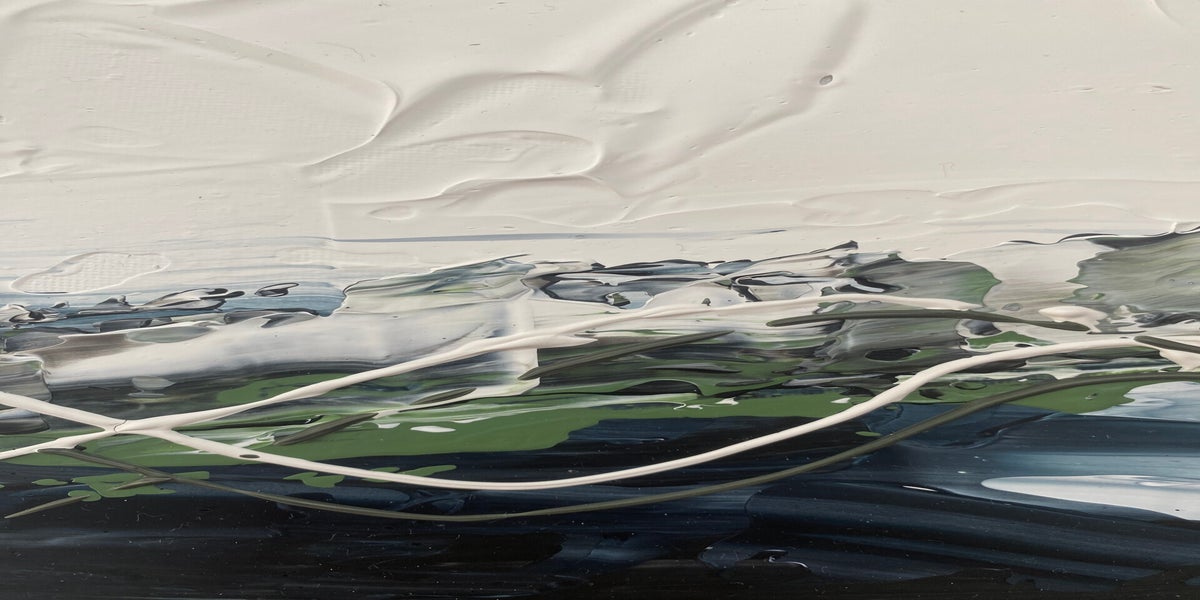 Die grauen Naturfarben sind in verschiedenen Schattierungen und Nuancen gemalt, um eine subtile, aber dennoch dynamische Farbpalette zu erzeugen. Einige Bereiche haben eine helle und fast weiße Grautönung, während andere einen tieferen und dunkleren Beige- und grünlichen Grauton aufweisen.