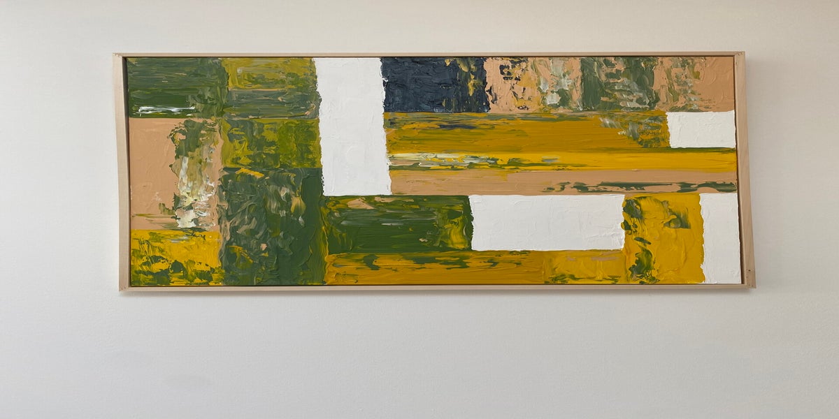 Das Kunstwerk fängt genau diese Farben ein und bringt durch den Schwung in die Mitte genau diese Atmosphäre in den Raum, in dem es bald hängen darf.