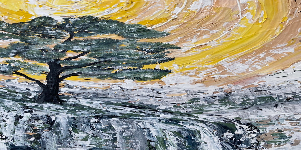 Das Bild "La Lune" zeigt einen gelb-orange getönten Himmelhintergrund, der sanft in die Ferne verläuft. Der Himmel erzeugt ein Gefühl von Ruhe und Frieden, während er den Raum für die Berg- und Baumstrukturen im Vordergrund schafft. Die dreidimesionale Struktur der Berge und Bäume ist von großer Bedeutung im Bild. Die Berge scheinen aus vielen Schichten von erdigem Material zu bestehen und erheben sich majestätisch in die Höhe. Der Mond bringt eine weitere Ebene von Ruhe und Mystik in das Bild. Der Mond ist deutlich zu sehen und wirkt fast wie ein Spiegelbild der strukturartigen Berge und Bäume im Vordergrund.