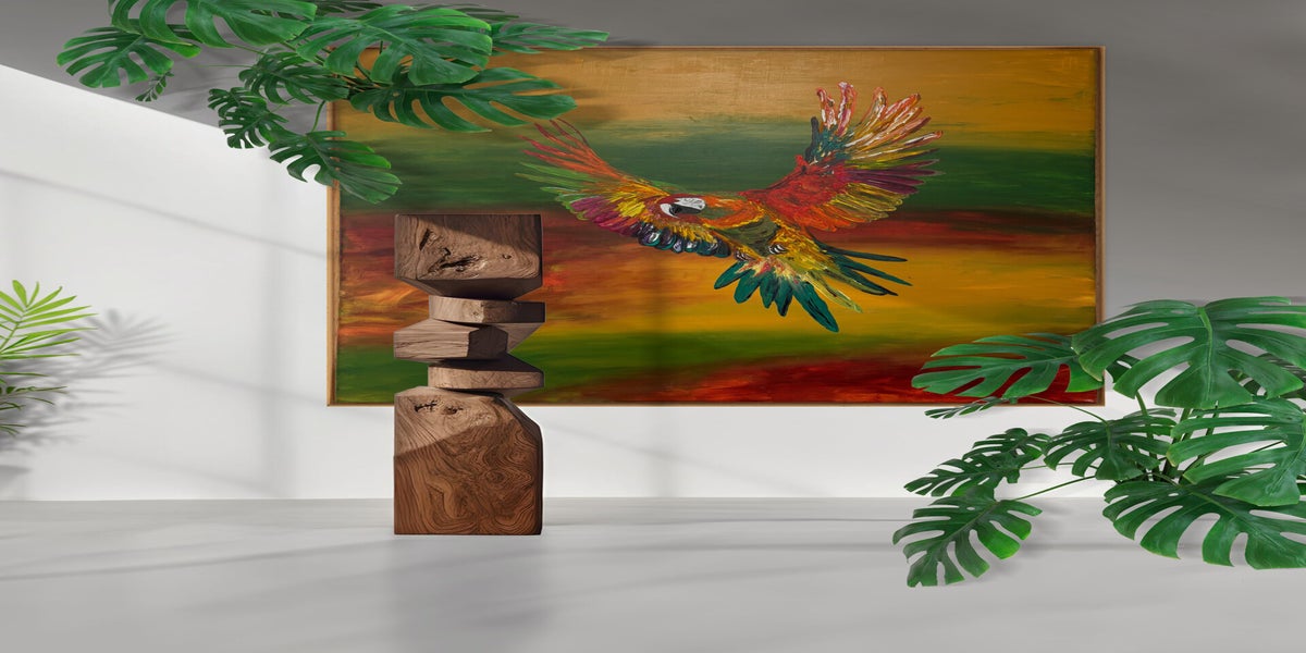 Ein bunter Papagei schwebt vor einem lebhaften Hintergrund aus strahlenden Farben.